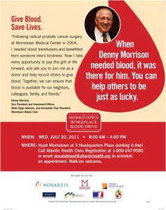 “Following radical prostate cancer surgery at Morristown Medical Center in 2004, I needed blood transfusions and benefitted from someone else’s kindness. Now I take every opportunity to pay this gift of life forward, and ask you to join me as a donor and help recruit others to give blood. Together, we can ensure that blood is available for our neighbors, colleagues, family, and friends.”