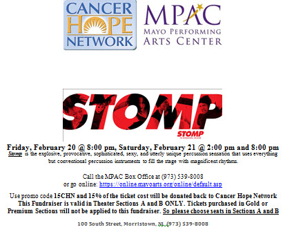 Cancer Hope Network will be joining forces with The Mayo Performing Arts Center in Morristown, NJ. Come join us and see STOMP!
