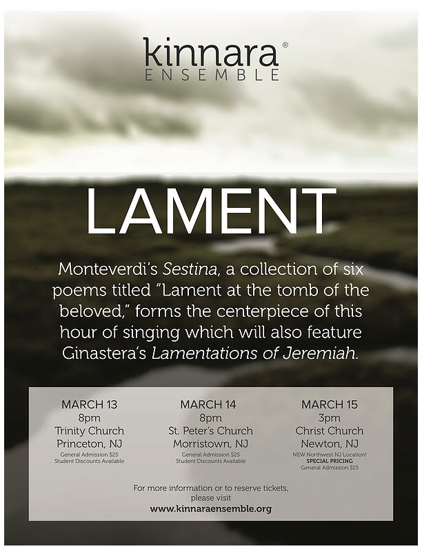 This concert will also feature Ginastera’s Lamentations of Jeremiah and other choral works. The concert will be held Saturday, March 14th at 8:00 P.M. at St. Peter’s Church in Morristown. Tickets are $25 with student discounts available.