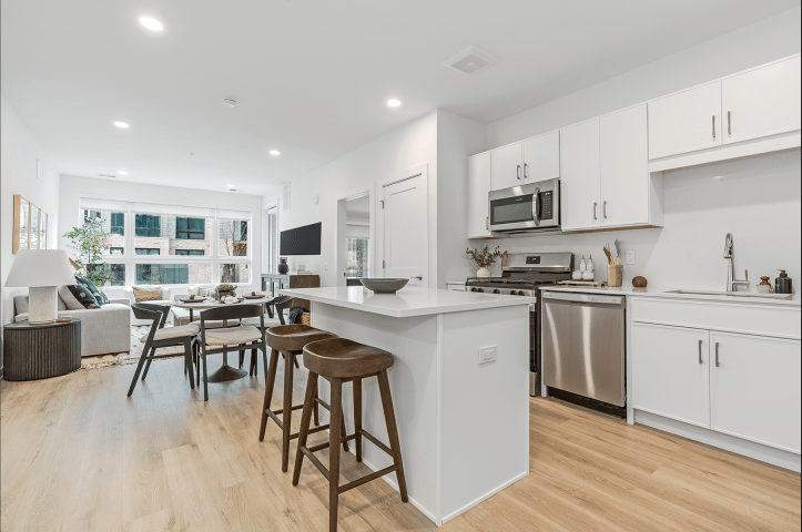 Homes are distinguished by condo-level finishes, including chef-inspired kitchens with Caesarstone countertops, stainless steel appliances, and spacious islands, as well as spa-inspired baths designed for relaxation. Additional touches include LVT flooring, walk-in closets, in-unit washer/dryers, and private outdoor spaces in select residences.
